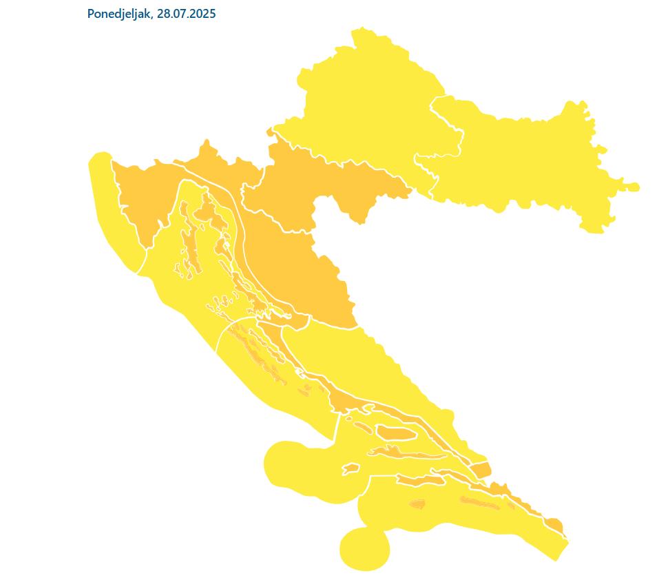 Zbog opasnosti od vremenskih nepogoda, meteoalarm je izdao narančasta upozorenja za karlovačku, gospićku, riječku, splitsku i dubrovačku regiju. Ostatak zemlje pod žutim je upozorenjem.