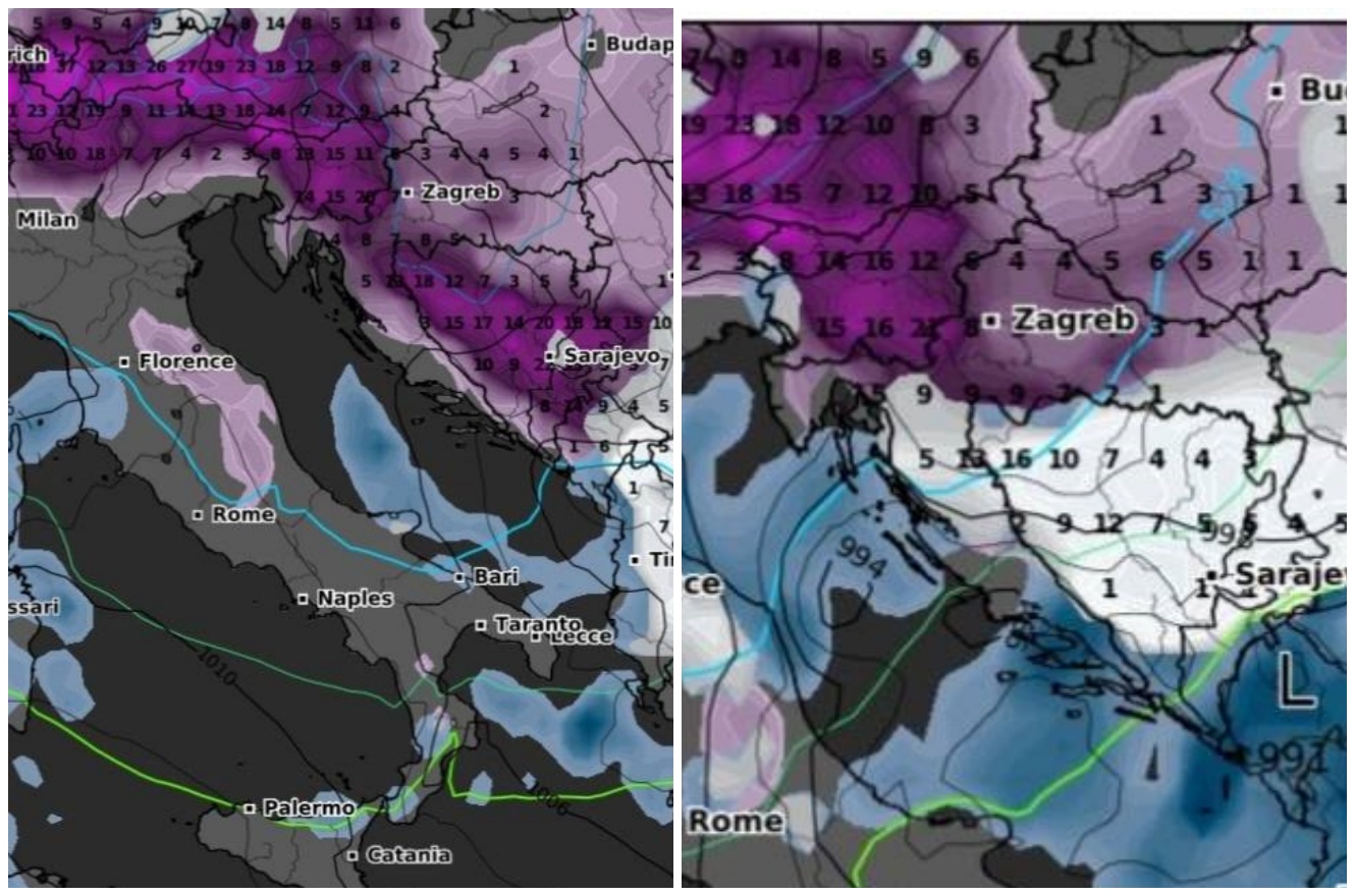 “Večerašnji modeli ne da nisu ukinule ciklonu Genovu koja nam dolazi idući tjedan uz kombinciju s ogrankom PV-a koji nam donosi suhi arktički zrak, već su je i pojačali. Rezultat bi bio ovo što su modeli iscrtali večeras, a to je sasvim obilate epizode snijega u kontinentu, a možda i koja pahulja doleprša uz obalu nošena jakom, olujnom i pravom zimskom Burom tada. Novi modeli s datumom u gornjem desnom uglu su Vam moji ‘Snjegoljubci’ u privitku”, napisao je Dundić.