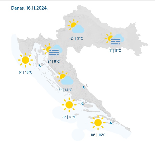 “U Gorskoj Hrvatskoj danju malo svježije, oko 8 °C, a na sjevernom Jadranu toplije – od 14 do 16 °C. No, ujutro u unutrašnjosti hladno, oko -2 °C, uz more pak 4 do 10 °C. I pritom sunčano, ali u gorskim kotlinama i u unutrašnjosti Istre nakon jutarnje magle. Na obali će još prijepodne puhati često umjerena i jaka bura s lokalno olujnim udarima.