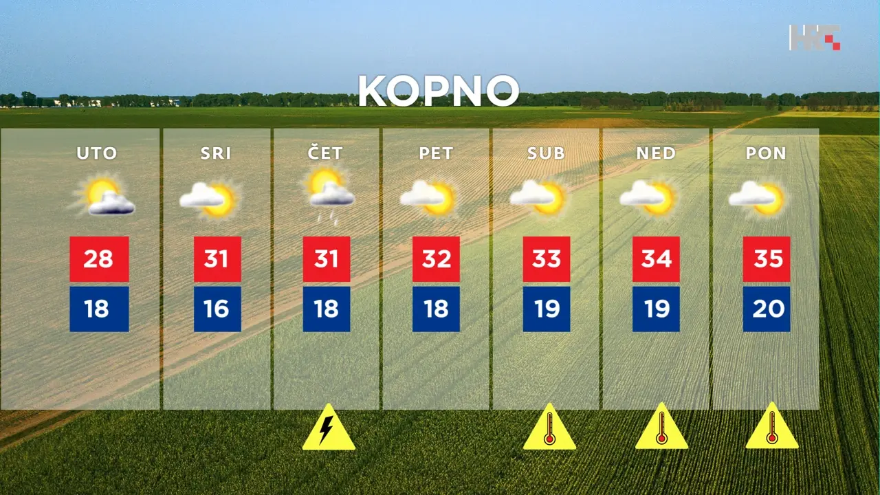 Danas, u srijedu, prevladavat će sunčano i vruće vrijeme, od sredine dana u zapadnim i središnjim predjelima povremeno umjerena naoblaka, osobito prema večeri lokalno i malo kiše ili pljusak praćen grmljavinom, prognozira Državni hidrometeorološki zavod (DHMZ).