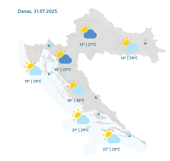 “Pretežno sunčano i vrlo toplo. Poslijepodne u unutrašnjosti uz umjeren razvoj oblaka moguć je poneki pljusak. Vjetar slab do umjeren sjeverni i sjeveroistočni. Na Jadranu ujutro umjerena bura, danju zapadni i sjeverozapadni vjetar. Najviša temperatura većinom između 25 i 30 °C”, prognoza je Državnog hidrometeorološkog zavoda (DHMZ) za četvrtak.