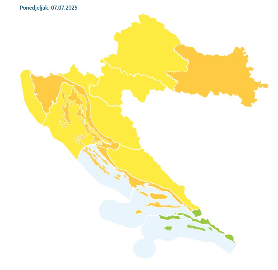 Sutra također i u kopnenim krajevima, osobito u Slavoniji, očekuje se ponegdje jako grmljavinsko nevrijeme s tučom pa je za to područje izdan narančasti meteoalarm.