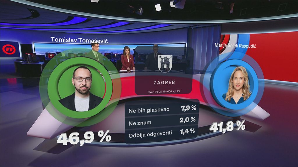 Prema najnovijem istraživanju agencije Ipsos za Dnevnik Nove TV, aktualni gradonačelnik Zagreba Tomislav Tomašević sigurno ulazi u drugi krug, dok se za drugo mjesto vodi neizvjesna utrka između Marije Selak Raspudić i Mislava Hermana.