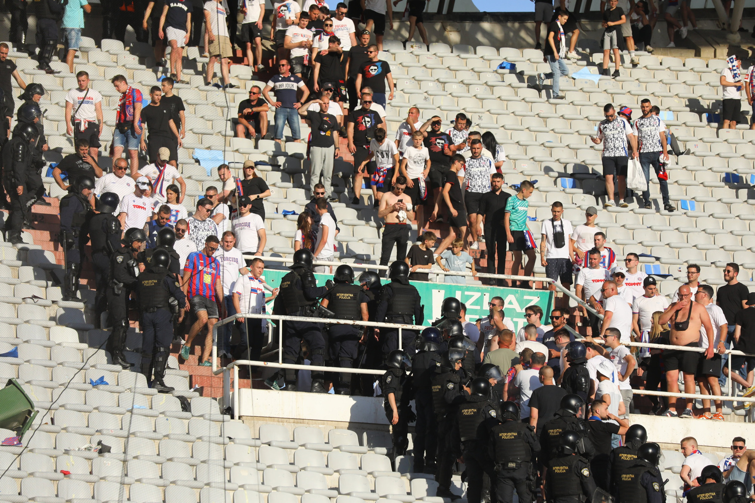 Nakon kraja utakmice uslijedio je još jedan incident kad je skupina navijača napala policajce blizu stadiona. “Osobe su na policijske službenike bacali kamenja, upaljena pirotehnička sredstva, metalnu ogradu. U službene prostorije privedeno je 36 osoba. Dvadeset i jedan policijski službenik je lakše ozlijeđen i djelatnici hitne medicinske pomoći su im sanirali ozlijede na terenu. Jedna osoba je zadržana u bolnici sa za sada neutvrđenim ozljedama. Nad jedanaest osoba je u tijeku kriminalističko istraživanje”, objavili su iz policije.