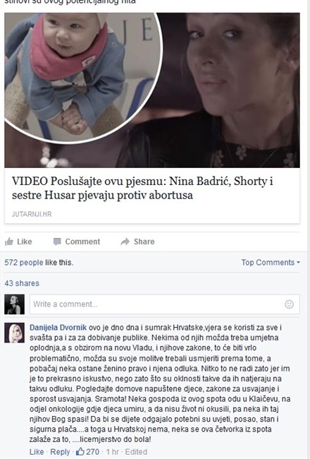 ”’Ne mogu vjerovati da danas kad ženama nije nimalo lako, jer uza sve obaveze koje imaju, najmanje imaju vremena za sebe, da im se dira i u to pravo, pravo na pobačaj. Živimo u 21. stoljeću, a vjera nam se nameće na svakom koraku. Ne dijelim te iluzije i zbog svega toga što se danas događa, ponekad se osjećam kao ugrožena manjina. Ja se oslanjam na samu sebe, ne namećem svoje svjetonazore drugima. Ovo četvero što pjevaju protiv pobačaja nisu mi ništa bolji od onih ljudi što s transparentima ‘dolje abortus’ protestiraju ispred bolnice Sveti Duh. Ništa me danas što se događa u Hrvatskoj nažalost ne iznenađuje, pa ni ova pjesma. Ali me rastužuje. Umjesto da se borimo za ženska prava, da ženama bude bolje, evo što imamo. To mi je apsurdno. Pozivati se na duhovnost i pjevati o nerođenoj djeci, to je dno dna’, rekla je Danijela za tportal.