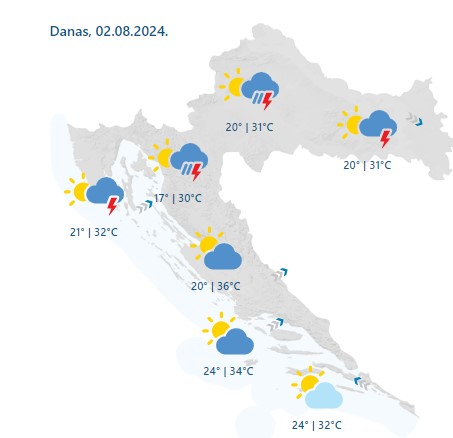 U Dalmaciji pretežno sunčano i dalje vruće, no u noći na subotu lokalno može biti pljuskova, ponajprije na sjevernom dijelu. Vjetar na kopnu većinom slab, na istoku i umjeren sjeverozapadni, a na Jadranu jugo i jugozapadnjak.