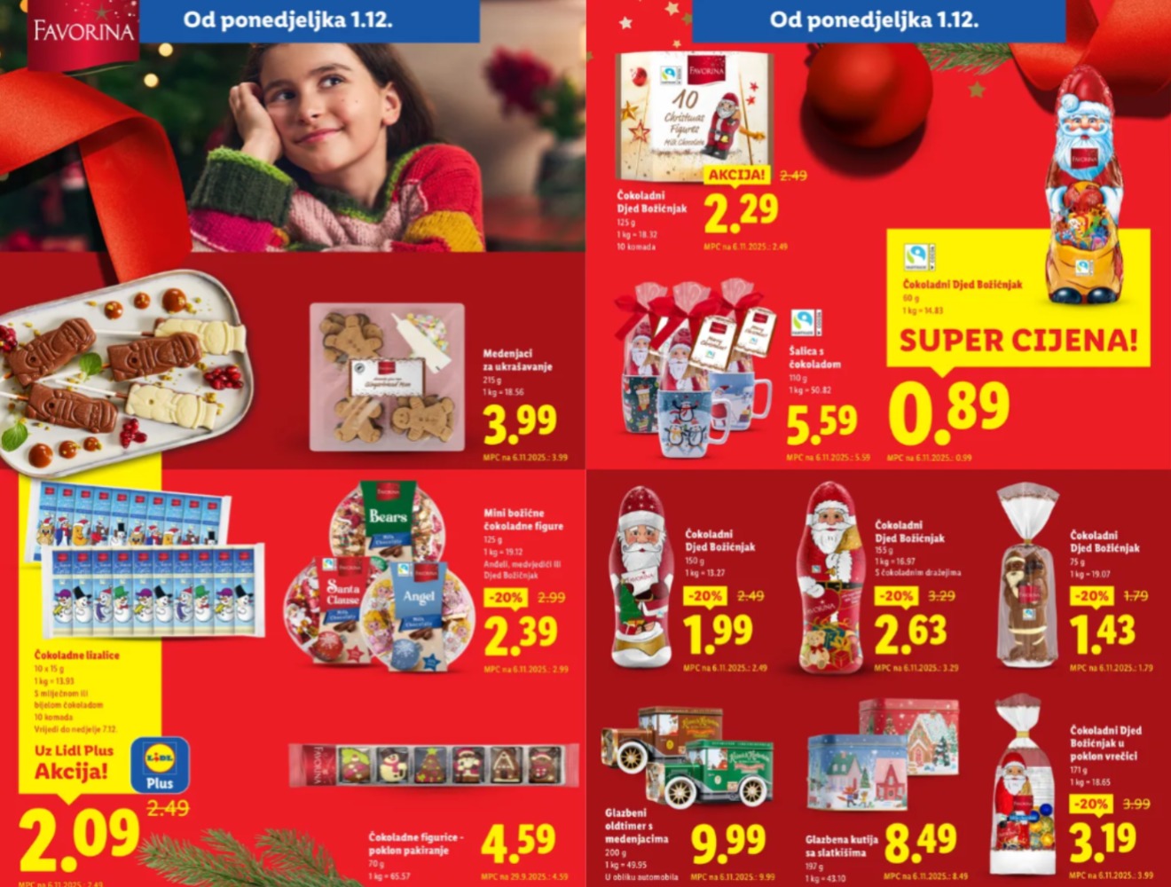Božićni kaktus je na akciji po 2,22 eura, a božićno drvce u jutenoj vreći je dostupno po cijeni od 14,99 eura od četvrtka, 4. prosinca. Čokoladni Djed Božićnjak od 150 grama prodaje se po 1,99 umjesto 2,49 eura, odnosno na sniženju od 20 posto.