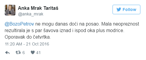 Saborska zastupnica Anka Mrak Taritaš zbog ozljede danas nije mogla doći u Sabor, o čemu je na Twitteru obavijestila javnost, ali i Božu Petrova… ili je barem mislila da je to učinila.