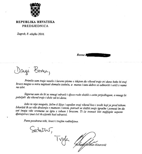 Predsjednica mu je odgovorila kako je primila njegovo “veselo i šareno pismo” s idejomda vikend traje tri dana te da je sigurna kako je to ideja s kojom bi se mnoga djeca i odrasli složili, a mnogi bi poželjeli da vikend traje i duže. Međutim, poručila mu je kako to ipak nije moguće.