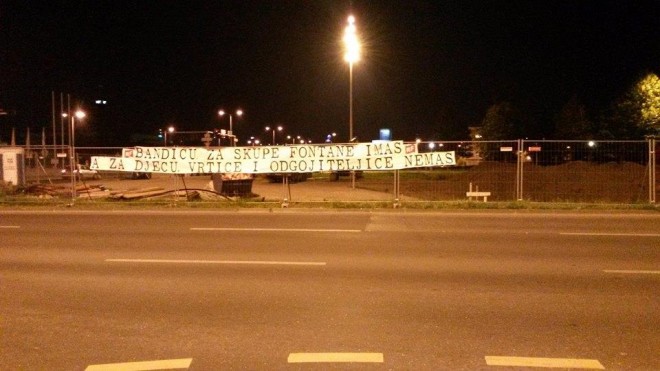 “Radnička fronta je noćas u zagrebačkoj ulici Hrvatske bratske zajednice, ispred novih Bandićevih fontana koje su u izgradnji, izvjesila poruku „Bandiću, za skupe fontane imaš, a za djecu, vrtiće i odgajateljice nemaš“.