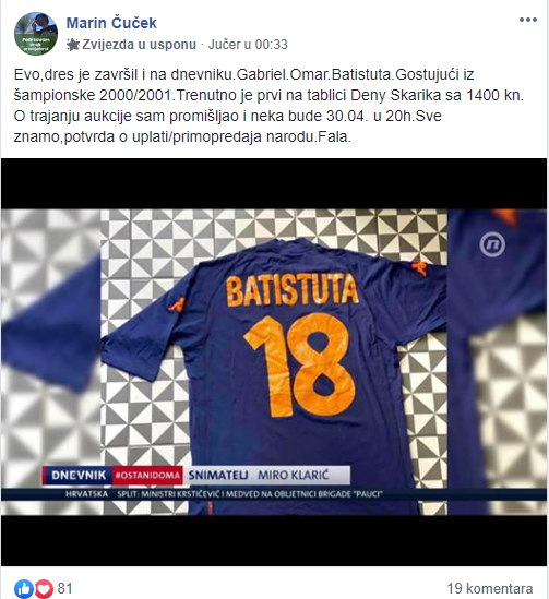 Tako su se u akciju uključili bivša ministrica Martina Dalić koja je na aukciju stavila potpisani dres Cristiana Ronalda, bivši nogometaš Hrvoje Štrok prodaje dres Igora Bišćana, javljaju se zagrebački vatrogasci koji spremaju seriju potpisanih kaciga i majica, stvarno razni znani i ne znani junaci.. Jer u ovoj priči svi su junaci i opet pokazujemo veliko srce kad je najpotrebije.