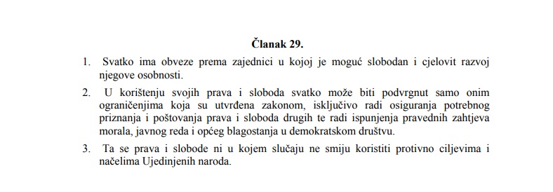 Tu dodatno podsjeća i na 29. članak Opće deklaracije o ljudskim pravima koji, pored prava, govori i o dužnostima koje imamo prema zajednici.