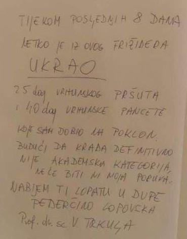 “Tijekom posljednjih 8 dana netko je iz ovog frižidera ukrao 25 dag vrhunskog pršuta i 40 dag vrhunske pancete koje sam dobio na poklon. Budući da krađa definitivno nije akademska kategorija neće biti ni moja poruka”, zaključio je autor poruke prof.dr.sc. Vladimir Trkulja i dodao – “nabijem ti lopatu u du** pede***** lopovska”.
