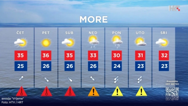 “Unatoč crvenom upozorenju na vrućinu, vrijednosti temperature će biti malo niže u središnjoj Hrvatskoj. Nakon sunčanog i tihog jutra, od sredine dana povremeno malo oblaka i većinom slab vjetar. Ponegdje na obali skromno olakšanje od vrućine pružat će vjetar s mora. Na sjevernom Jadranu sunčano, no u gorskim krajevima dnevni razvoj oblaka i mogućnost popodnevnih pljuskova. Najviša temperatura zraka između 32 i 37 stupnjeva”, rekla je.