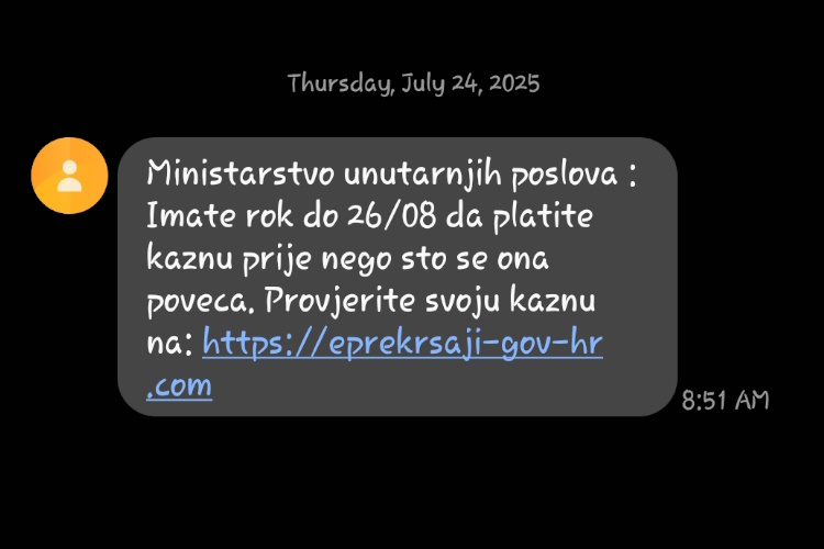 “Policijski službenici Ministarstva unutarnjih poslova nikada ne šalju građanima obavijesti o počinjenim prekršajima putem SMS poruka, niti traže unos osobnih podataka ili podataka s bankovnih kartica (uključujući broj kartice i CVV kod) u bilo kakav internetski obrazac ili na mrežnu stranicu. Službene obavijesti dostavljaju se isključivo preporučenom poštom, u pisanom obliku”, napominju iz policije.