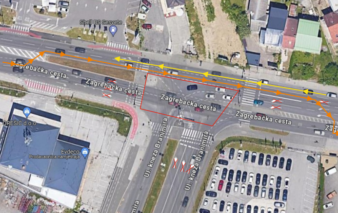 Zabranjeno će biti prometovanje iz Zagrebačke ceste u Ulicu kneza Branimira (smjer istok-jug), kao iz Ulice kneza Branimira prema ulici Dubrava (smjer jug – zapad).
