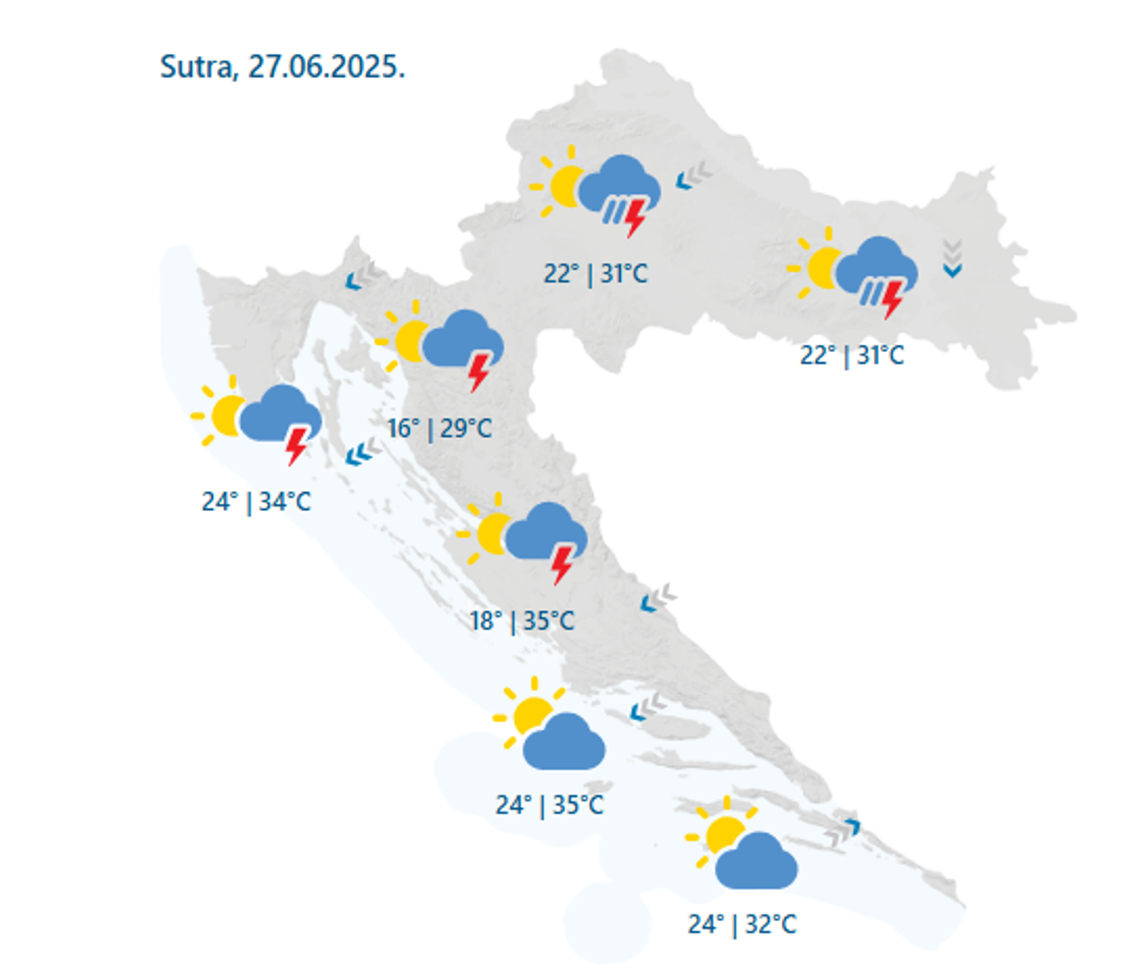 Unatoč mogućim pljuskovima i osvježenju, temperature zraka i dalje će biti visoke. Jutarnje će se vrijednosti kretati između 18 i 23 °C, u Lici nešto niže, dok će duž Jadrana biti između 22 i 26 °C. Najviše dnevne temperature bit će između 28 i 32 °C u većini krajeva, a na moru i u unutrašnjosti Dalmacije ponovno se očekuju vrlo vruće vrijednosti između 32 i 36 °C.