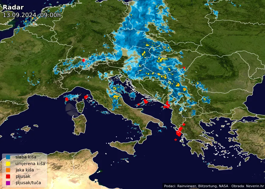 Meteoalarmi su upaljeni za cijelu Hrvatsku, u osječkoj, zagrebačkoj, karlovačkoj, gospićkoj, kninskoj, splitskoj i dubrovačkoj regiji zbog obilnih pljuskova s grmljavinom, dok je u Dalmaciji upozorenje zbog olujne bure. Jesenska kiša natapača pada u cijeloj Istri i okolici. Obilnih količina bit će posvuda, piše Istramet.