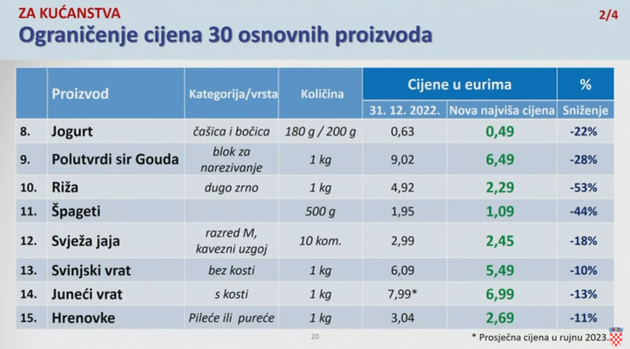 Nove cijene za 30 osnovnih proizvoda za kućanstva, kojima će se vratiti stara cijena od prije uvođenja eura, predstavio je premijer prije nekoliko dana. Proizvodi kojima je već ograničena cijena su jestivo suncokretovo ulje, mlijeko s 2,98 posto mliječne masti, brašno glatko tip 500 i brašno oštro tip 400, bijeli šećer kristal, cijelo pile i svinjsko mljeveno meso.