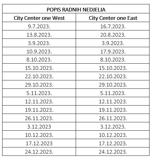 Prema rasporedu objavljenom na stranicama City Centera One vidi se da će prva radna nedjelja na ovom šoping centru na zapadu grada biti 9. srpnja, a onom na istoku 16. srpnja.