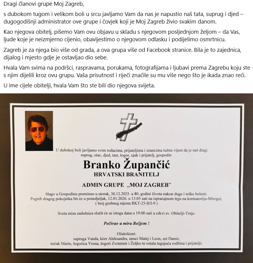 “Dragi članovi grupe Moj Zagreb, s dubokom tugom i velikom boli u srcu javljamo Vam da nas je napustio naš tata, suprug i djed – dugogodišnji administrator ove grupe i čovjek koji je Moj Zagreb živio svakim danom.