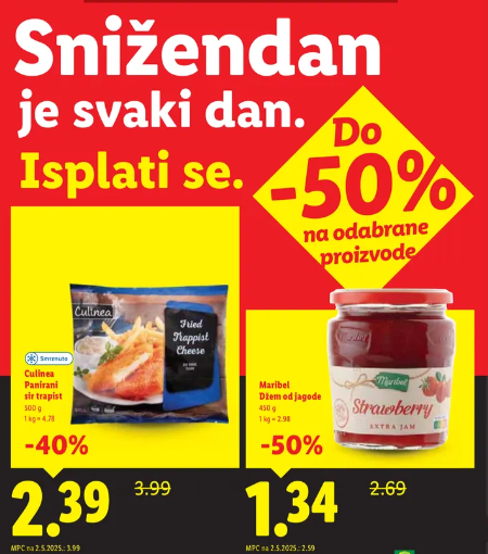 Od prehrambenih proizvoda na akciji su od četvrtka 27. studenog panirani sir trapist od pola kilograma na akciji za 2.39 eura. U pola cijene je snižen Maribel džem od jagode 1.34 eura za 400 grama.