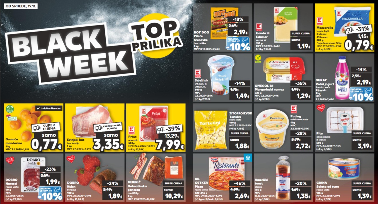 Sir mozzarela K-Classic je snižen s 1,15 na 0,79 eura, odnosno na sniženju od 31 posto. Gavrilović kobasice raznih vrsta u Family packu od 900 grama se prodaju po 11,99 eura.