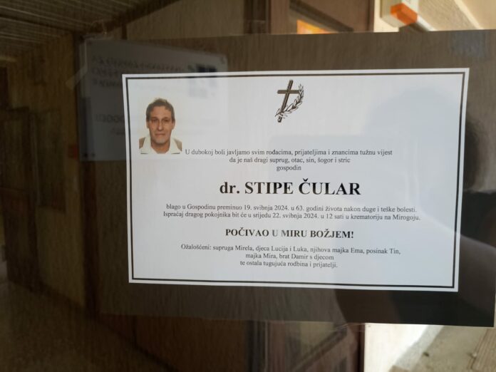 Zagreb je prije koji dan ostao bez omiljenog pedijatra i velikog stručnjaka za liječenje najmlađih pacijenata, doktora Stipe Čulara, koji je radio u Domu zdravlja Špansko. Doktor Čular preminuo je u 63. godini života nakon duge i teške bolesti.