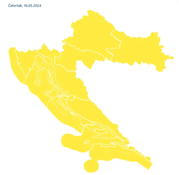 Najviša temperatura zraka od 20 do 25 Celzijevih stupnjeva, ponegdje u Gorskoj Hrvatskoj malo niža. Za cijelu Hrvatsku upaljen je žuti meteoalarm zbog pljuskova s grmljavinom i olujnih udara.