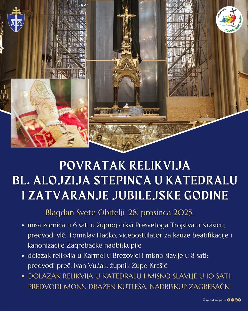 Poseban trenutak svečanosti bit će doček povratka relikvija bl. Alojzija Stepinca iz Krašića u Zagrebačku prvostolnicu. Relikvije će krenuti iz Krašića odmah nakon mise zornice u 6 sati, koju će predvoditi vlč. Tomislav Hačko, vicepostulator za kauze beatifikacije i kanonizacije Zagrebačke nadbiskupije.