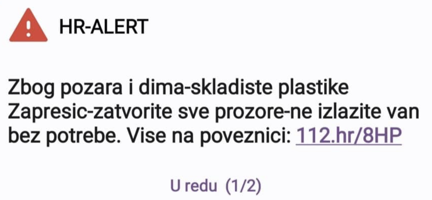 Građani koji se nalaze u Zaprešiću dobili su u srijedu navečer na mobitele upozorenje Sustava za rano upozoravanje i upravljanje krizama (SRUUK) kojim ih se, zbog požara u zaprešićkoj tvrtki EKO FLOR PLUS, poziva da zatvore prozore i ne izlaze van.