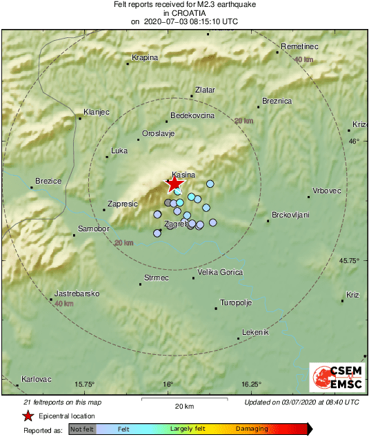 M2.3 #earthquake (#potres) strikes 11 km N of Zagreb – Centar (#Croatia) 25 min ago. Effects reported by eyewitnesses: pic.twitter.com/LOgxmvpor6