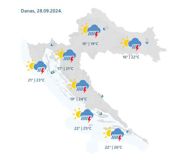 “Sa zapada jače naoblačenje s kišom. Lokalno će biti i obilnih pljuskova s grmljavinom. Zapuhat će umjeren sjeverni i sjeveroistočni vjetar. Umjereno do jako jugo i jugozapadnjak u Dalmaciji će okretati na sjeverozapadnjak, a na sjevernom Jadranu će popodne zapuhati bura i jačati. Najviša dnevna temperaturaod 18 do 23, na Jadranu od 22 do 26 °C. Poslijepodne na kopnu osjetni pad temperature zraka”, prognoza je DHMZ-a za Hrvatsku danas.