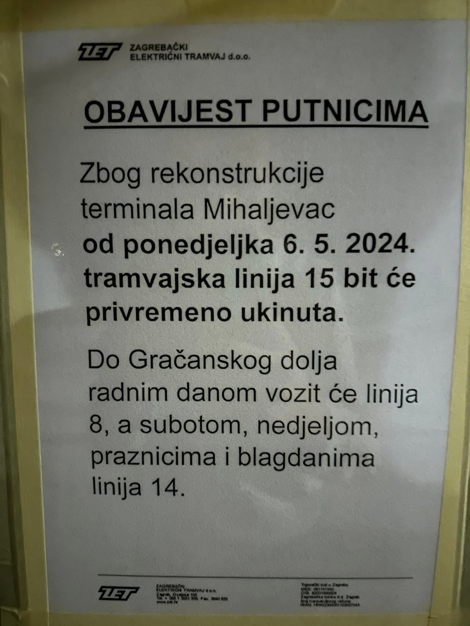 Podsjetimo, iz ZET-a su najavili da će u zoni neposredno uz terminal Mihaljevac, biti privremeno uspostavljena autobusna stajališta “Mihaljevac” i to za liniju 102 u Ulici Mlinovi, u smjeru Britanskog trga (iznad terminala), odnosno za linije 140 i 233 na Gračanskoj cesti, u smjeru Sljemena / Markuševca (prije skretanja za dječji vrtić).