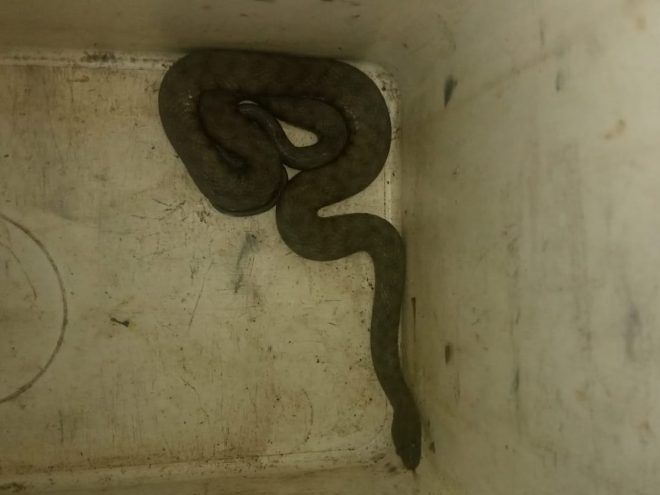Jednu je gospođu na Borongaju zmija iznenadila ispred ulaza u kuću. Nakon susreta s ljudskom vrstom zmija je odgmizala do kante za smeće. Čim smo došli, smukulju smo smjestili u transportni spremnik. Pustili smo je na mirnom mjestu u prirodi.