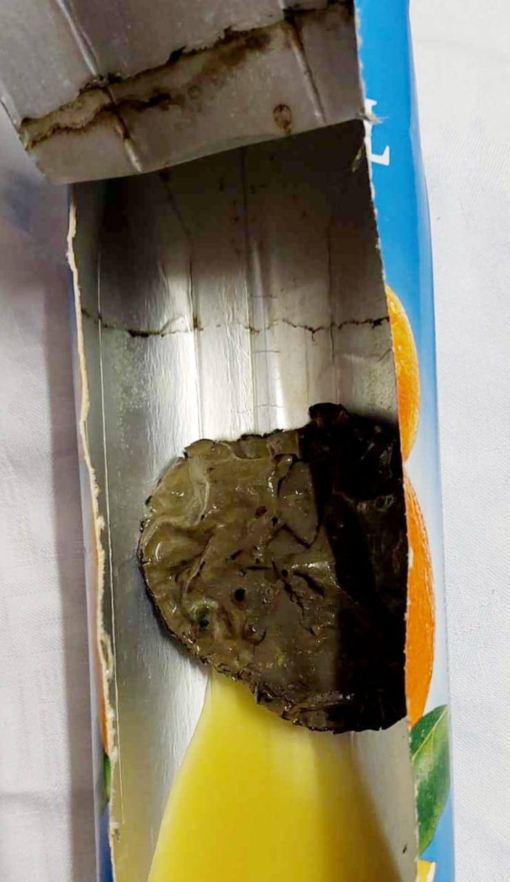 No, međutim, sat, dva nakon toga krenula sam popiti još jednu čašu i osjetila kako mi je nešto kao pljusnulo u tetrapaku. S time da sam u čaši vidjela i nešto sivo, dok je sok iz tetrapaka otežano curio.