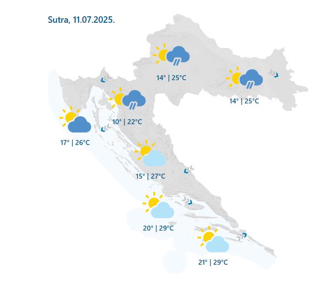 U petak pretežno sunčano, osobito u Dalmaciji. Poslijepodne i navečer u unutrašnjosti i na sjevernom Jadranu uz jači razvoj oblaka mjestimice moguća kiša ili pokoji pljusak. Vjetar slab do umjeren sjeveroistočni, u Slavoniji i sjeverozapadni.