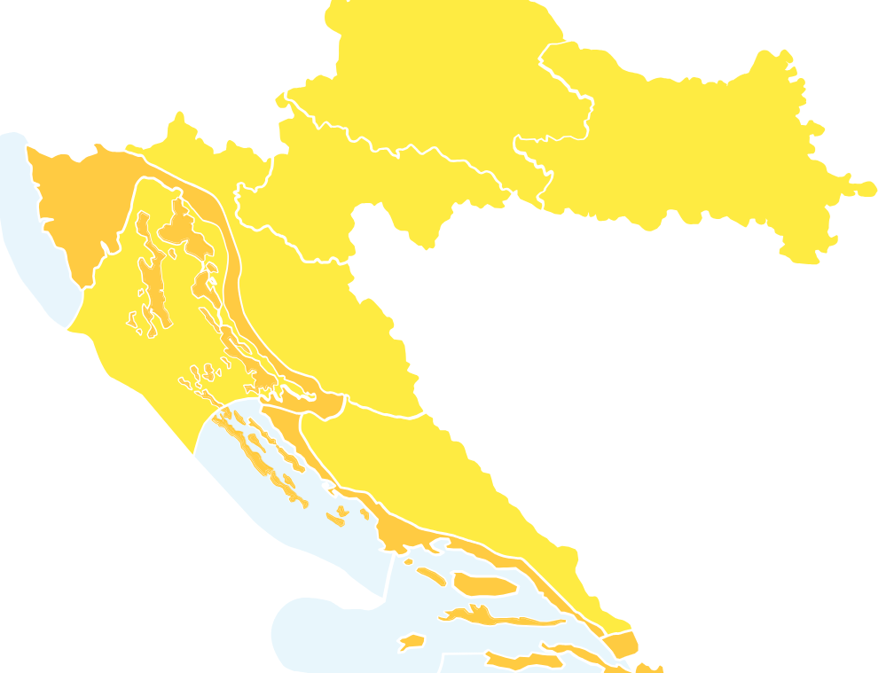 Žuto upozorenje je zbog toplinskog vala izdano za zagrebačku, osječku, karlovačku, gospićku i kninsku regiju. Za Kvarner i Kvarnerić te Velebitski kanal je također izdano žuto upozorenje, ali zbog vjetra.