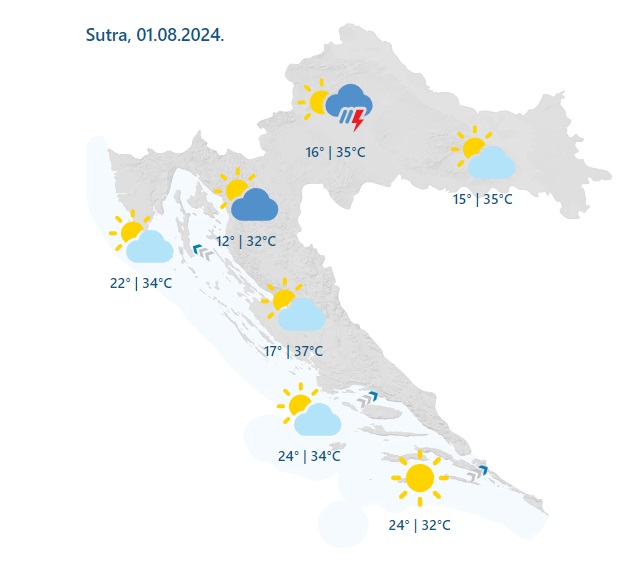 Sunčano i vruće. Vjetar na kopnu slab, na Jadranu ujutro mjestimice umjerena bura, a popodne sjeverozapadnjak, uz obalu i jugozapadnjak. Najviša dnevna temperatura od 30 do 35 °C, u unutrašnjosti Dalmacije ponegdje malo viša.