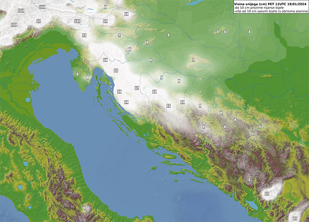 S padom temperature kiša će u petak u unutrašnjosti prelaziti u susnježicu i snijeg kojeg do kraja dana može biti i u unutrašnjosti Istre i Dalmacije. U Gorskoj Hrvatskoj već do sredine dana može biti debljeg snježnog pokrivača.
