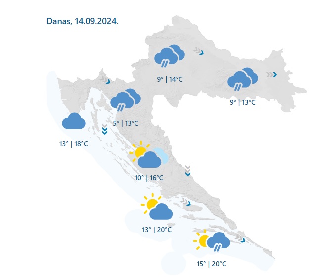 Prema posljednjoj prognozi od subote ujutro z Hrvatskoj će tijekom dana biti pretežno oblačno, u Dalmaciji i sunčana razdoblja. U unutrašnjosti povremeno kiša, češća prema kraju dana. Na Jadranu kiša samo mjestimice, uglavnom na jugu u noći i ujutro.