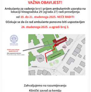 „O privremenoj obustavi rada ambulante i organizaciji za vrijeme preseljenja pravovremeno smo: obavijestili sve klinike unutar KBC-a Sestre milosrdnice, tjedan dana prije preseljenja postavili obavijest u prostorima dosadašnje ambulante, objavili obavijesti na internetskim stranicama: https://klinkemija.kbcsm.hr/ i https://www.kbcsm.hr/zavodi/klinicki-zavod-za-kemiju/ te obavijestili naše suradne ustanove.