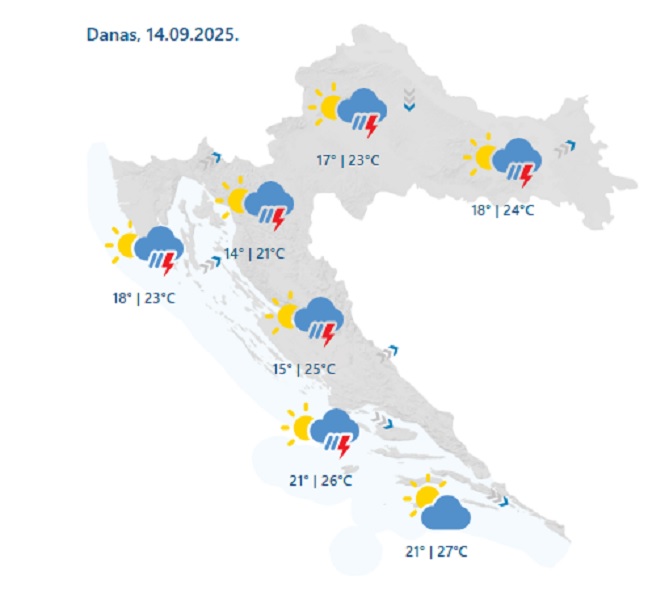 “Lokalno mogući izraženiji pljuskovi s grmljavinom uz prolazno jak sjeverozapadni vjetar. Vjerojatnost grmljavine > 60 %”, Dhmz piše za zagrebačku regiju, slična su upozorenja i za ostatak Hrvatske.