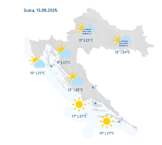 Vjetar većinom slab, na Jadranu slaba do umjerena bura i sjeverozapadnjak. Najniža temperatura zraka uglavnom između 9 i 13, na Jadranu od 16 do 19 °C.
