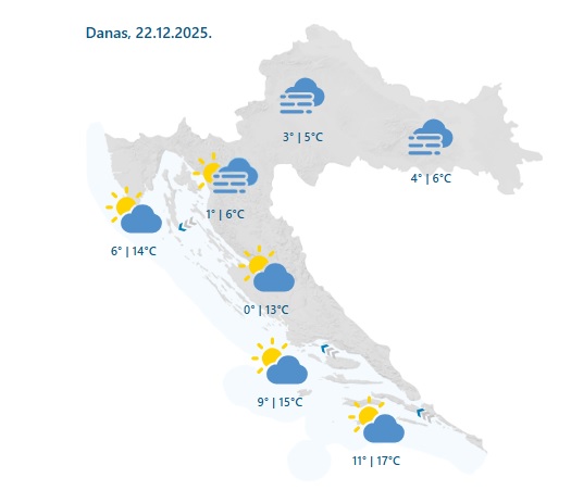 Vjetar uglavnom slab. Na Jadranu će slaba do umjerena bura okretati na jugo i navečer jačati. Najviša temperatura zraka između 3 i 7, na Jadranu i u unutrašnjosti Istre i Dalmacije od 13 do 17 °C.