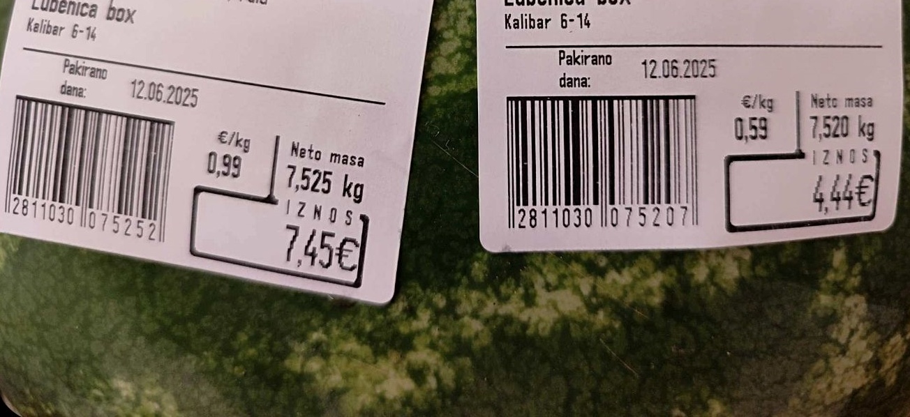 “Svako malo, na žalost, pišemo o sve češćoj praksi u hrvatskim trgovinama gdje isti proizvod na dvije ili tri vage bude izmjeren s drugom težinom ili drugom cijenom. Lubenica izmjerena na dvije vage, zbog kontrole težine, pokazala je odstupanje u težini, ali i veliku razliku u ukupnoj cijeni. Tri eura razlike na 7,5 kg nije malo novaca, zar ne?! Odnosno, zamalo pa je duplo više plaćeno…