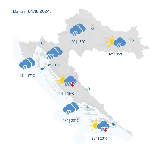 Promjenjivo, u unutrašnjosti pretežno oblačno. Mjestimice kiša, na Jadranu i pljuskovi s grmljavinom. Češća sunčana razdoblja u Dalmaciji. Vjetar slab, ponegdje do umjeren sjeveroistočni. Na Jadranu umjerena, podno Velebita u prvom dijelu dana jaka bura, u Dalmaciji poslijepodne sjeverozapadnjak, uz obalu i jugozapadnjak. Najniža temperatura zraka od 6 do 11, na Jadranu od 12 do 17 °C. Najviša dnevna uglavnom između 10 i 15, na Jadranu od 16 do 21 °C.