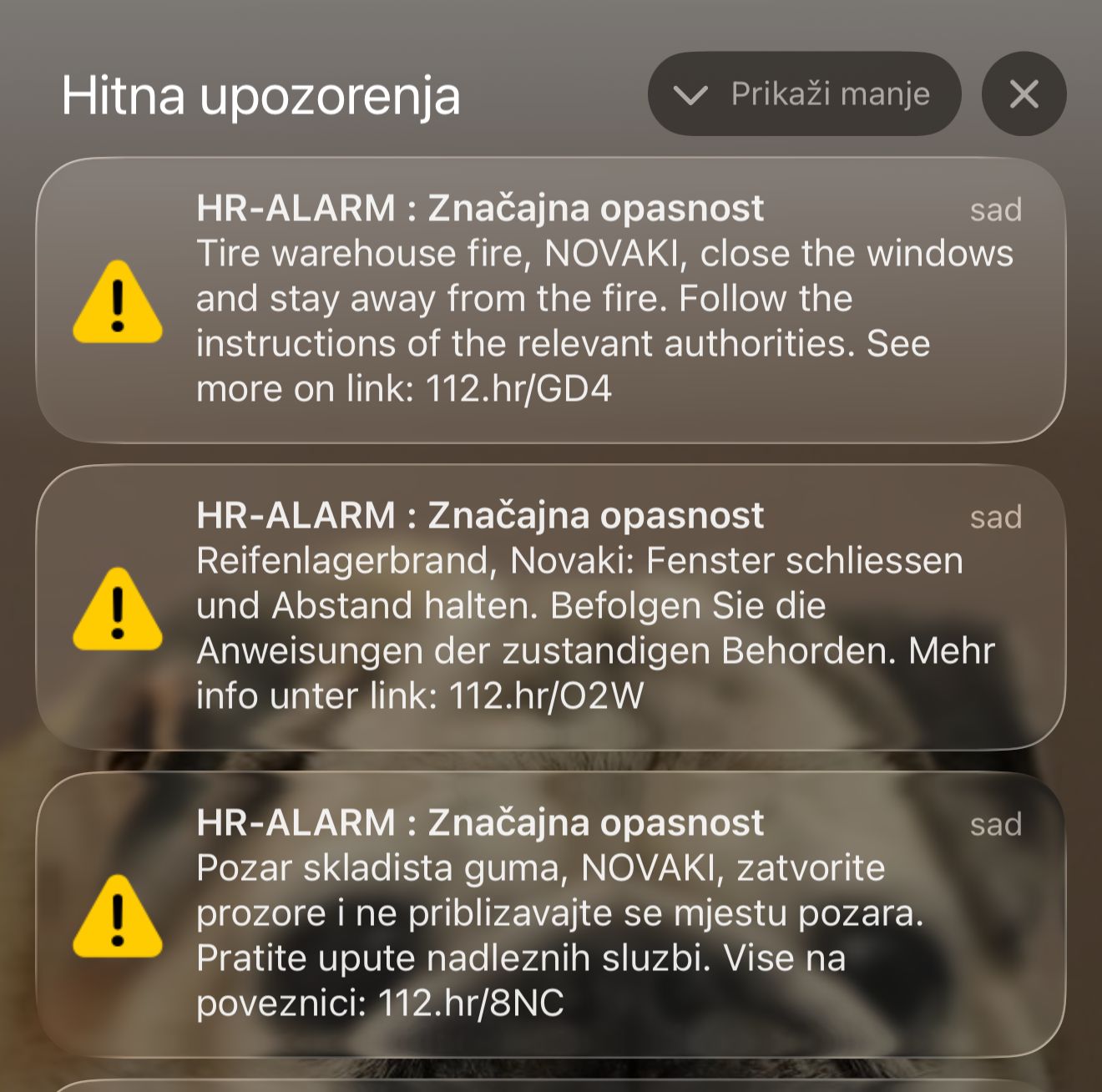 U pitanju su bile poruke upozorenja na raznim jezicima zbog požara skladišta guma u Svetoj Nedelji i dima koji se proširio.