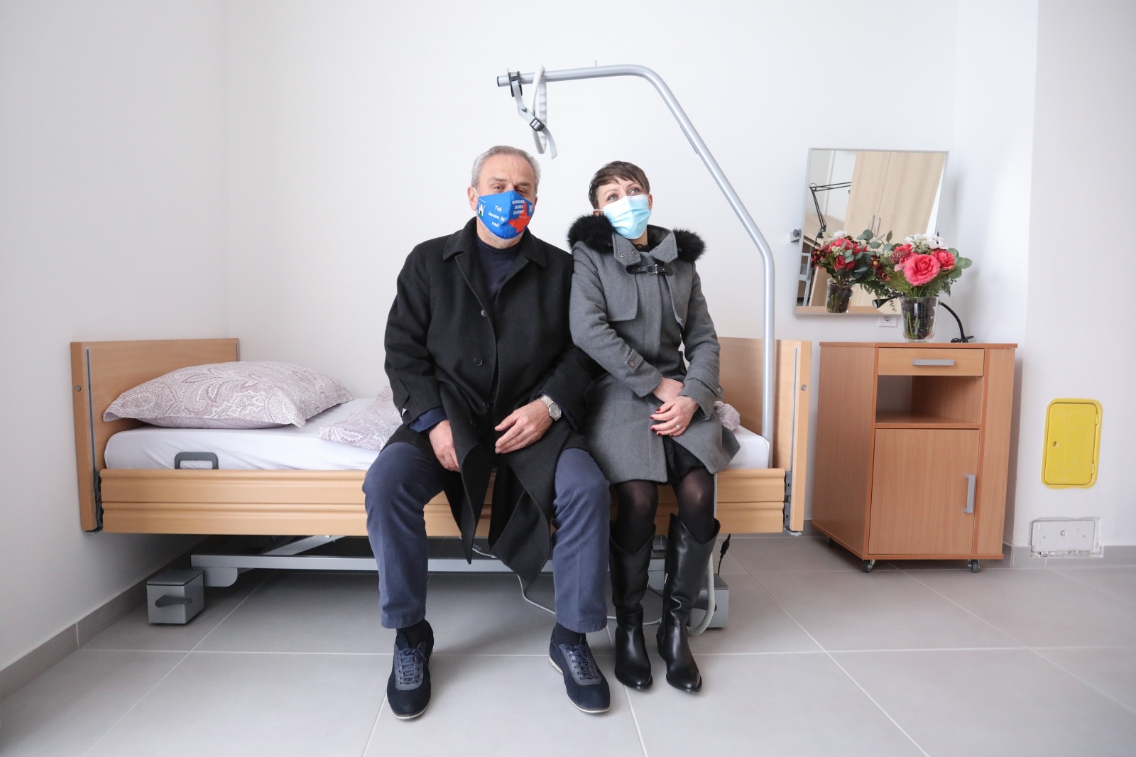 Bandić je priliku iskoristio za fotografiranje, a na jednoj od slika pozira sjedeći na krevetu opremljenom za korisnike Centra. sjedi vrlo blizu žene, vjerojatno zaposlenice Centra.