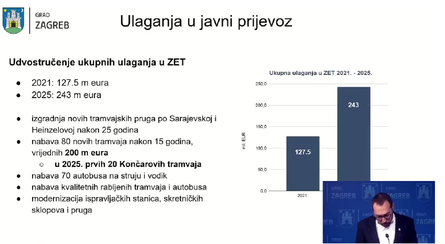 Gradonačelnik je preuzeo riječ nakon svojih zamjenika i predstavio nova ulaganja u ZET, i pritom usporedio grafikonom koliki je točno rast ulaganja u odnosu na prošlu administraciju. Daleko najveći projekt unutar sustava javnog prijevoza je nova tramvajska pruga.